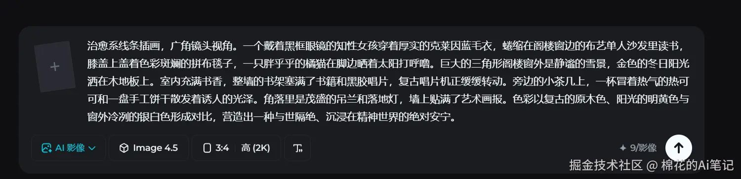 第一步:生成高质量底图 我们使用即梦AI的生图功能(推荐使用Image 4.5或5.0模型)。在提示词中强调“广角镜头、治愈系插画、雪景窗户、光影细节”。