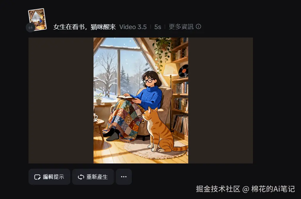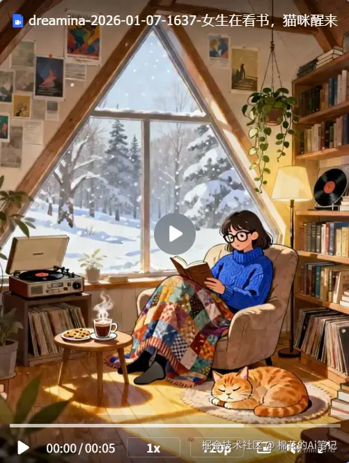 第二步:图生视频 将生成的图片导入“视频生成”模块。为了让画面更生动,我们在提示词中输入:“女生轻微翻书,猫咪伸懒腰醒来,窗外雪花飘落”。