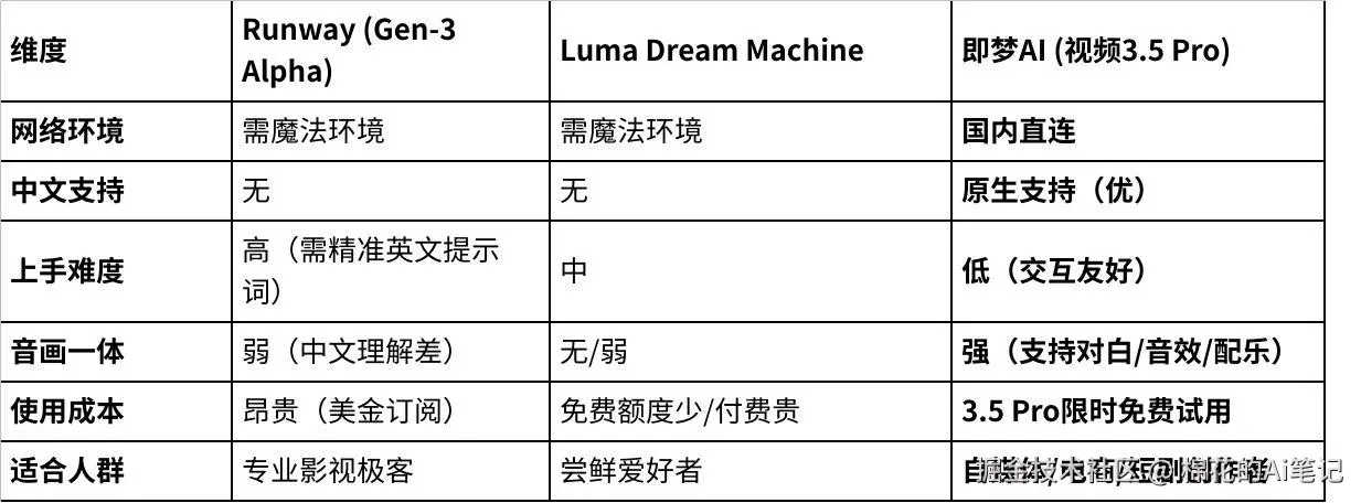 为了给各位一个更全面的参考,我也同期测试了海外两款头部工具:Runway Gen-3 Alpha 和 Luma Dream Machine。我们抛开复杂的参数,直接看它们在实际使用中的优缺点。