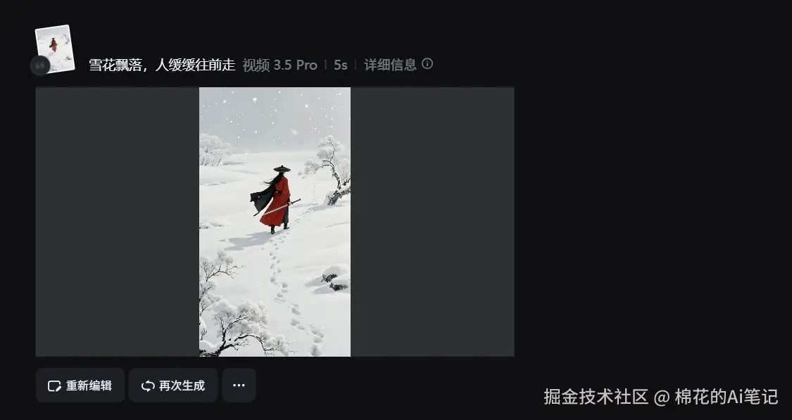 第二步:启用3.5 Pro模型进行生成 在视频生成界面,选择“视频 3.5 Pro”模型。 提示词输入: “大雪纷飞,红衣剑客在雪地中缓缓独行,脚下踩出深深的脚印,伴随着沉重的踩雪声和远处凛冽的寒风声。”