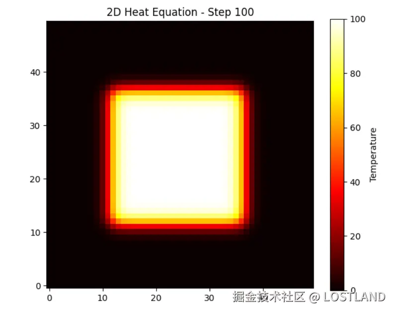 图:二维温度场热力图,红色表示高温,黄色/蓝色表示低温。