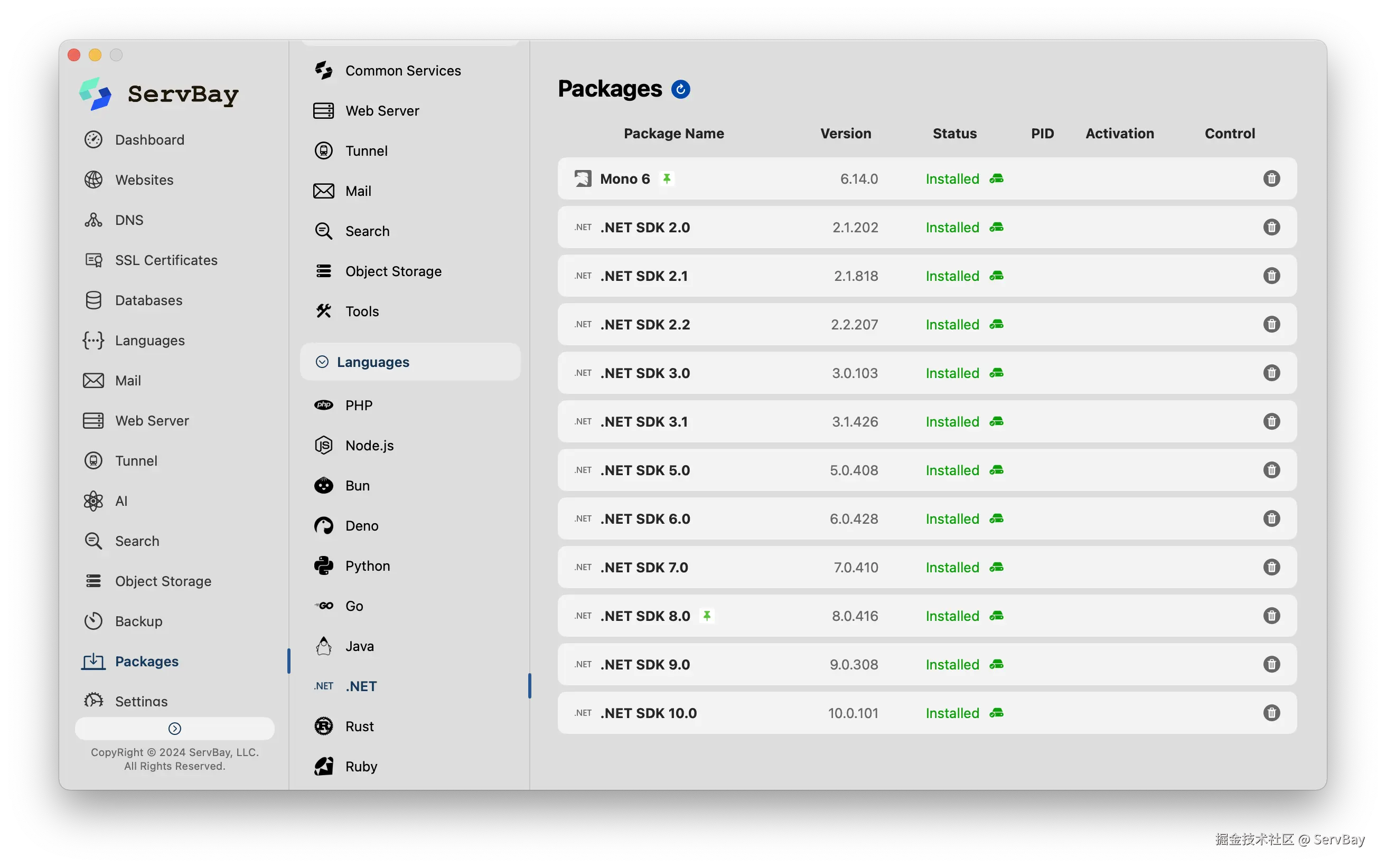 在本地配置.NET环境时,多个运行版本还是挺麻烦的,涉及大量的环境变量切换。使用 ServBay 就能一键安装 .NET 环境,支持范围极广,从 .NET 2.0 一直到 .NET 10.0,甚至包含了 Mono 6。