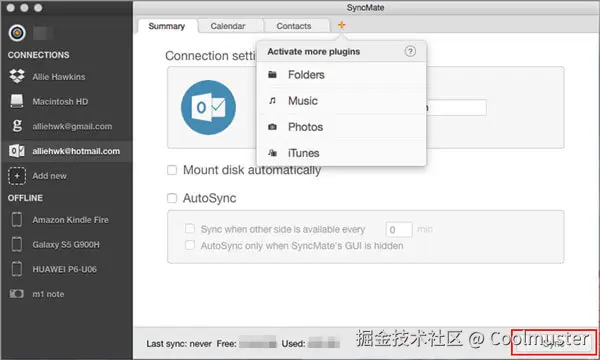 这款Android文件传输替代方案可让您的Android和Mac保持最新状态。只需在Android和Mac上都安装SyncMate应用,即可自动同步和更新文件。具体来说,它会将您的Android设备挂载为外部磁盘,并支持同步日历、联系人、播放列表、音乐、文件夹和照片。