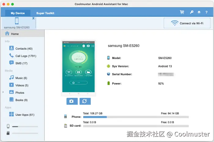 Coolmuster Android Assistant被誉为最佳Android文件传输替代方案。有了它,您可以一键将文件从Android设备传输到Mac ,也可以将Mac上的备份恢复到Android设备。它支持多种文件类型,例如联系人、短信、通话记录、视频、照片、音乐、应用、书籍等等。不仅如此,它还允许您在Mac上管理Android文件:添加、删除、编辑联系人,安装、卸载应用等等。