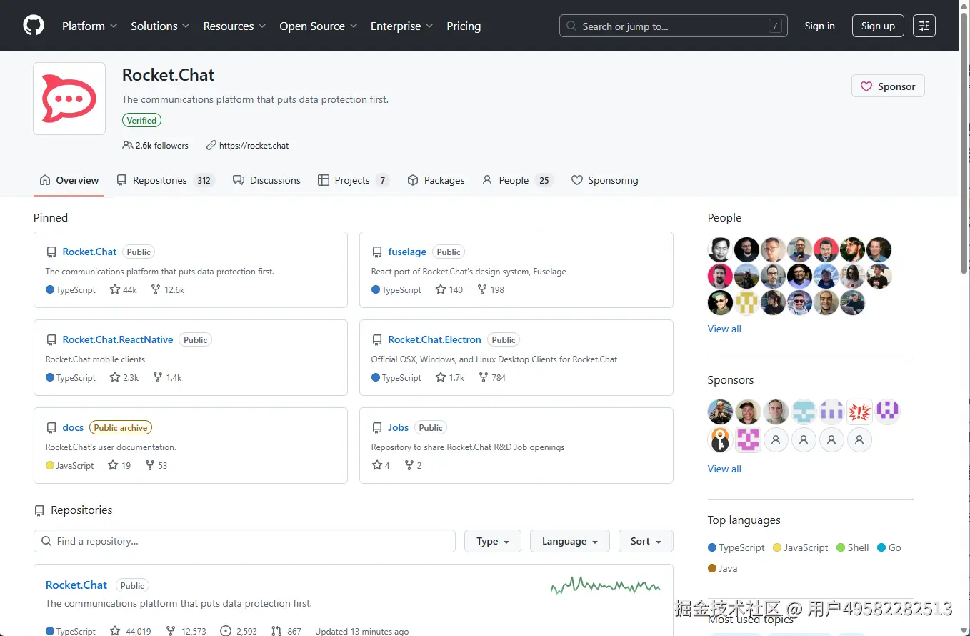 Rocket.Chat 是目前最受欢迎的开源团队沟通协作平台之一,狂揽 38.3k Star。你可以把它看作是 Slack 或 Microsoft Teams 的完美开源替代品。它功能强大,支持频道、私聊、音视频通话、屏幕共享,并且可以通过插件无限扩展。