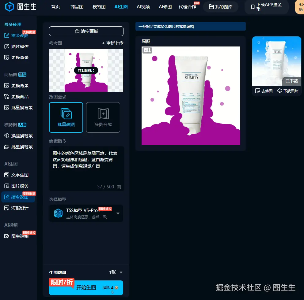 点击「开始生图」,30秒左右即可生成泡沫逼真、背景清爽的电商广告图;效果不满意可微调指令重新生成。