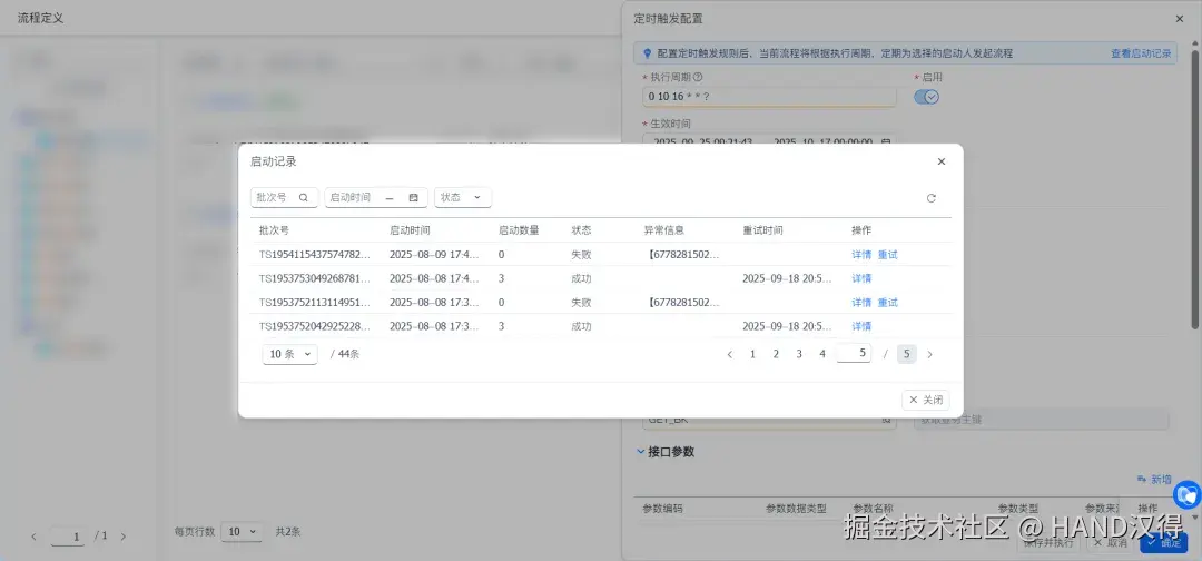 可选择保存定时触发规则或立即执行此定时触发规则,定时规则触发后,可在【定时启动记录】中查看到通过当前规则启动的流程。可查看异常批次中启动异常流程的异常原因并支持一键重试。