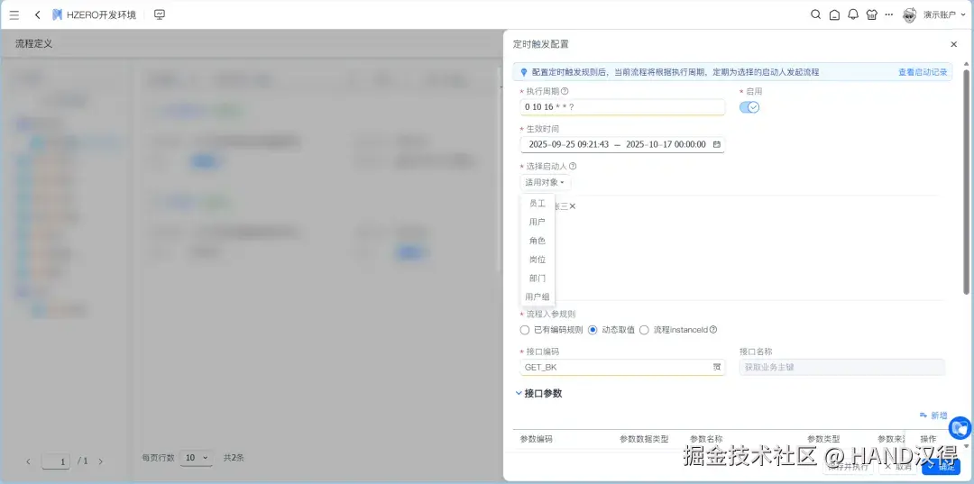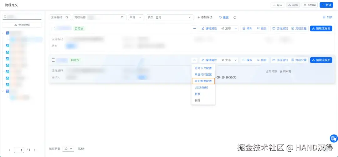 进入【定时触发配置】创建定时触发规则 功能入口:流程定义列表>更多>定时触发配置