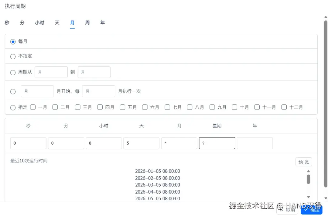 配置规则 Step 1 配置执行周期:定时触发规则的执行周期,配置执行周期为每月5号上午8点。