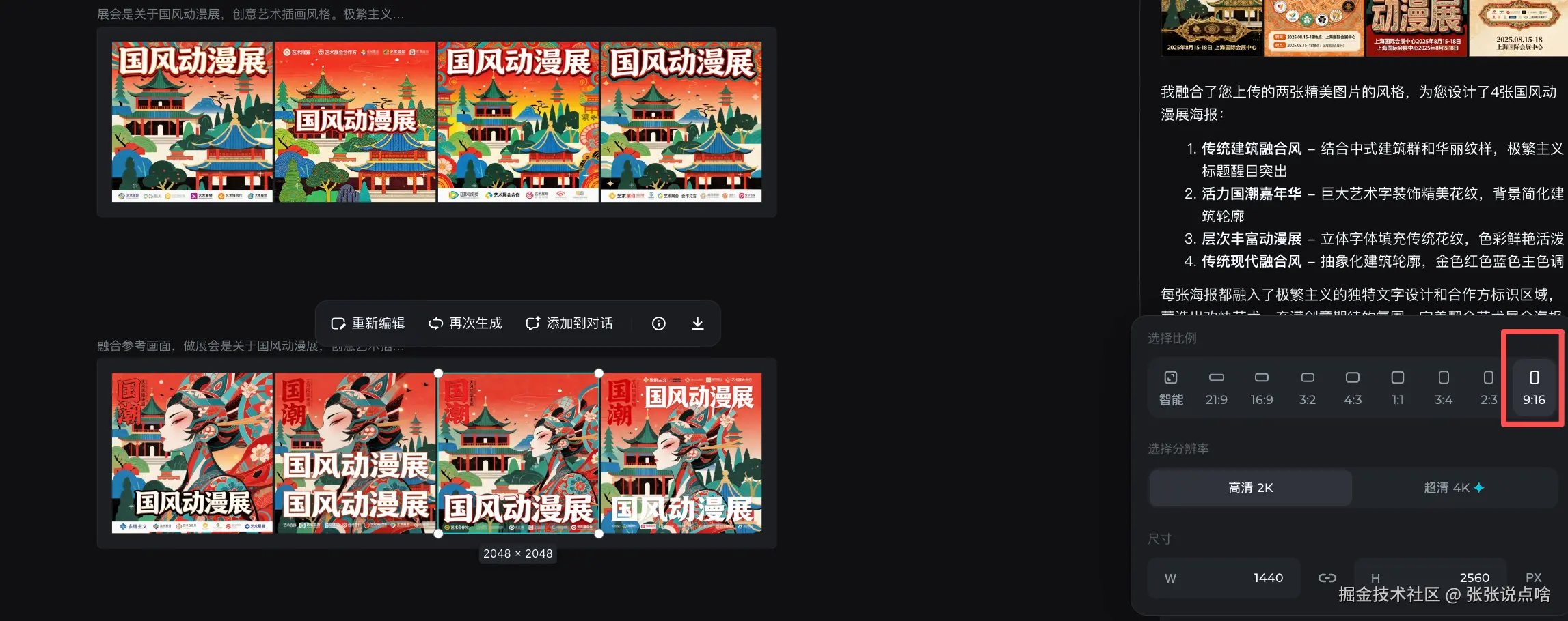 - 调整图像尺寸: 即梦AI提供了多种尺寸选项,根据社交媒体平台(小红书和公众号内页)不同的显示需求,选择了1:1(小红书)和16:9(公众号内页)的尺寸。