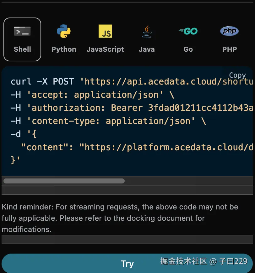 另外如果想生成对应的对接代码,可以直接复制生成,例如 CURL 的代码如下: