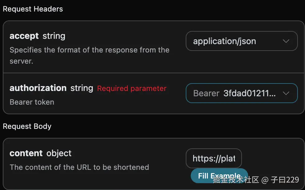 accept:想要接收怎样格式的响应结果,这里填写为application/json,即 JSON 格式。authorization:调用 API 的密钥,申请之后可以直接下拉选择。
