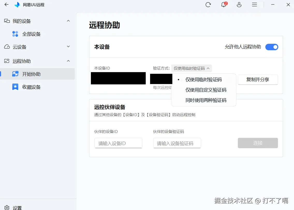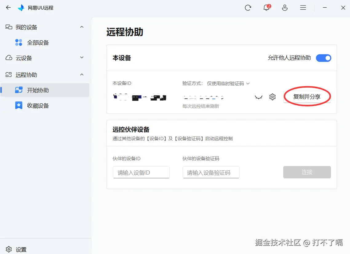 免登录功能彻底颠覆了这一模式:被协助方无需注册账号,也无需输入手机号、邮箱等个人信息,只需打开 APP,进入【远程协助】板块,即可直接显示本设备 ID和动态验证码。更便捷的是,APP 内提供 “复制并分享” 一键功能,可直接复制设备 ID、验证码及专属连接,通过微信、QQ、短信等任意社交工具发送给协助方。