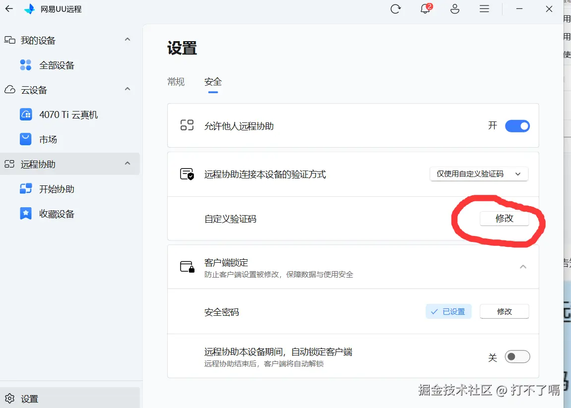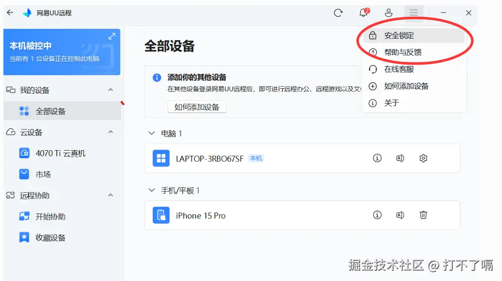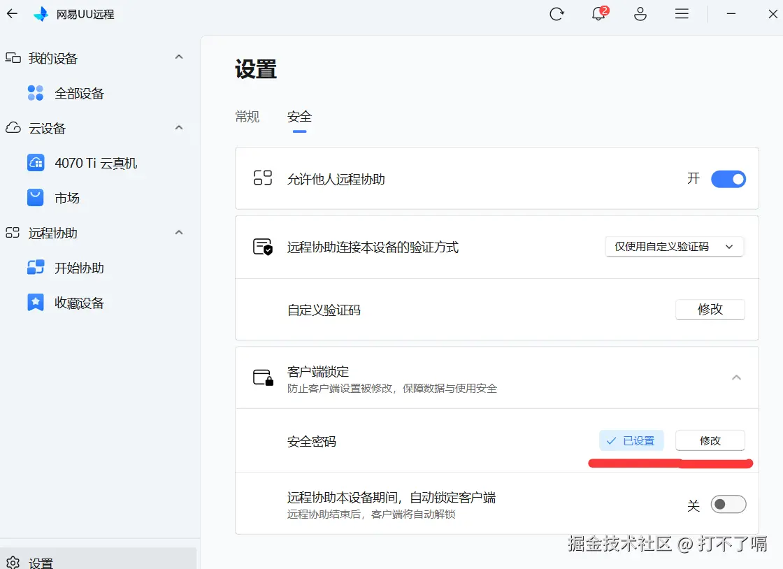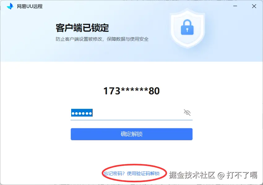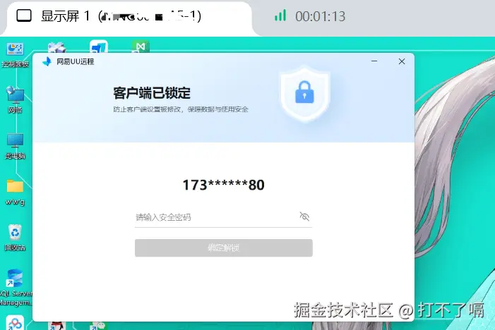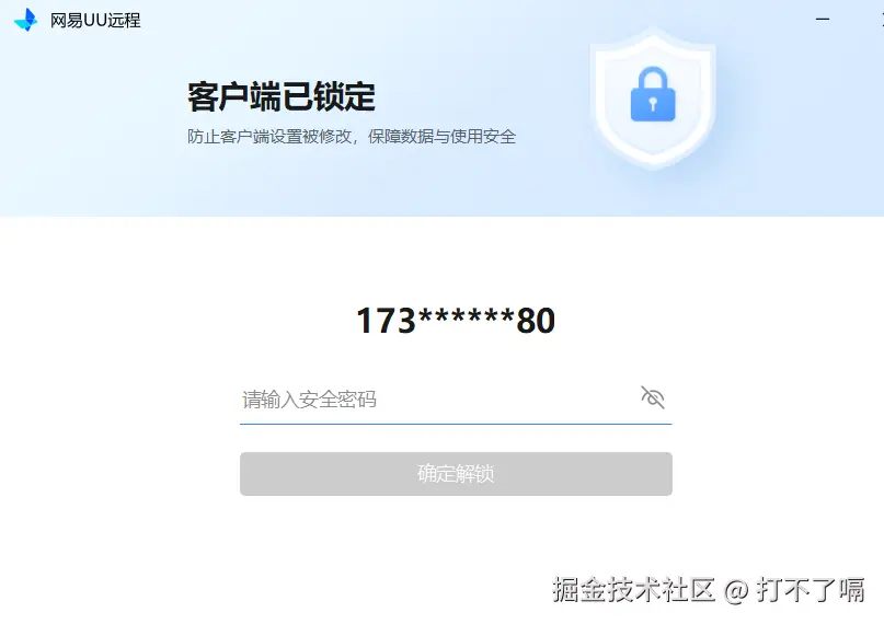 当我们在办公远程求助处理电脑问题时,中途临时外出买东西、取快递,只需开启 UU 远程客户端安全锁的自动锁定模式,就能在不中断远程协助的前提下,仅锁定 UU 远程软件本身 —— 既能防止协助方误操作退出软件,又能杜绝软件内部核心参数被查看或修改,同时完全不影响电脑上其他软件的正常运行;等你外出回来输入安全密码即可解锁,既不耽误问题处理,又能稳稳守住隐私,完全不用操心外出期间的信息泄露风险。
