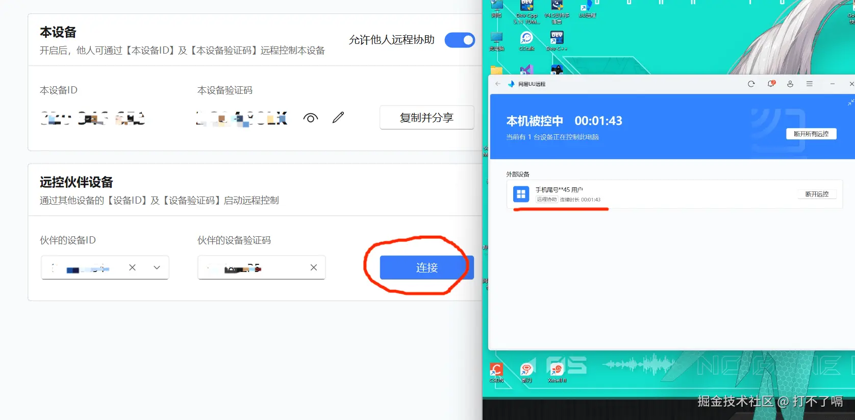 拿取设备ID和设备验证码点击连接即可发起远程控制