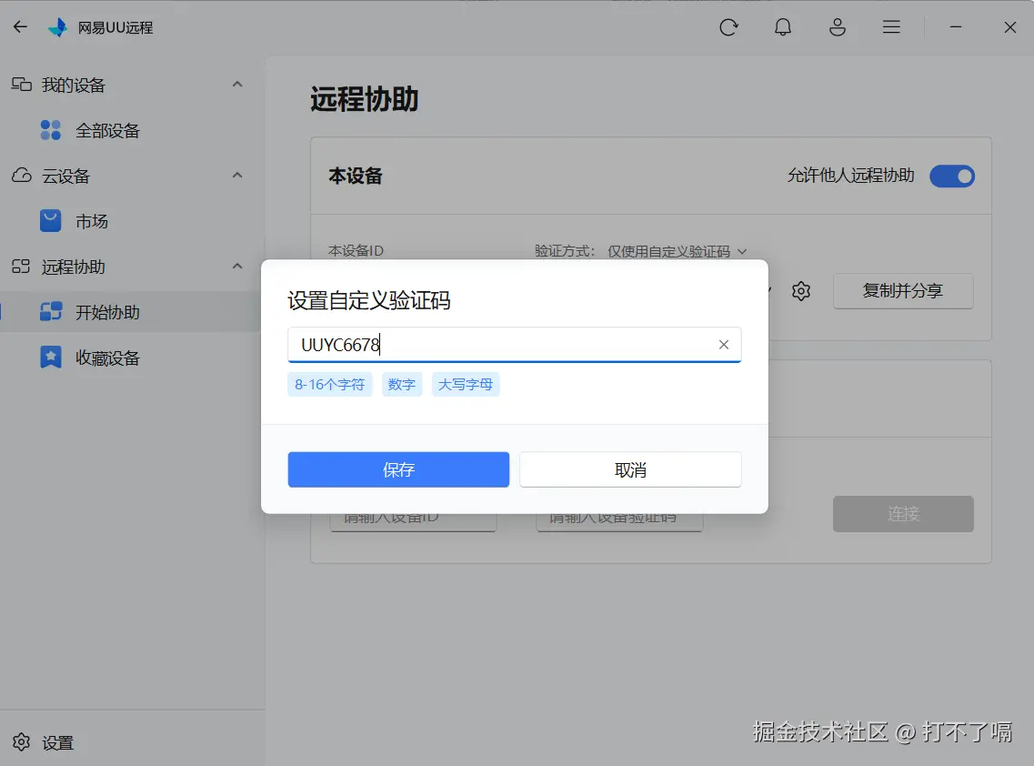 远程协助验证码专属自定义设置:针对远程协助高频场景,支持8-16位数字+字母的组合形式自由配置,用户可根据使用场景灵活选择长度,高安全需求场景可选用16位复杂组合。这种自定义模式打破了传统固定格式验证码的限制,既能通过个性化组合降低熟悉人群的记忆成本,又能凭借长度与字符组合提升安全防护等级。