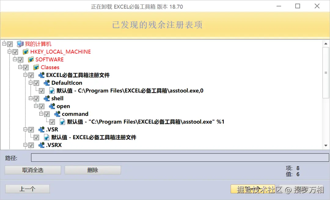 软件在卸载完成以后会扫描卸载的应用程序的残余注册表项,然后点【删除】即可把程序彻底卸载干净。