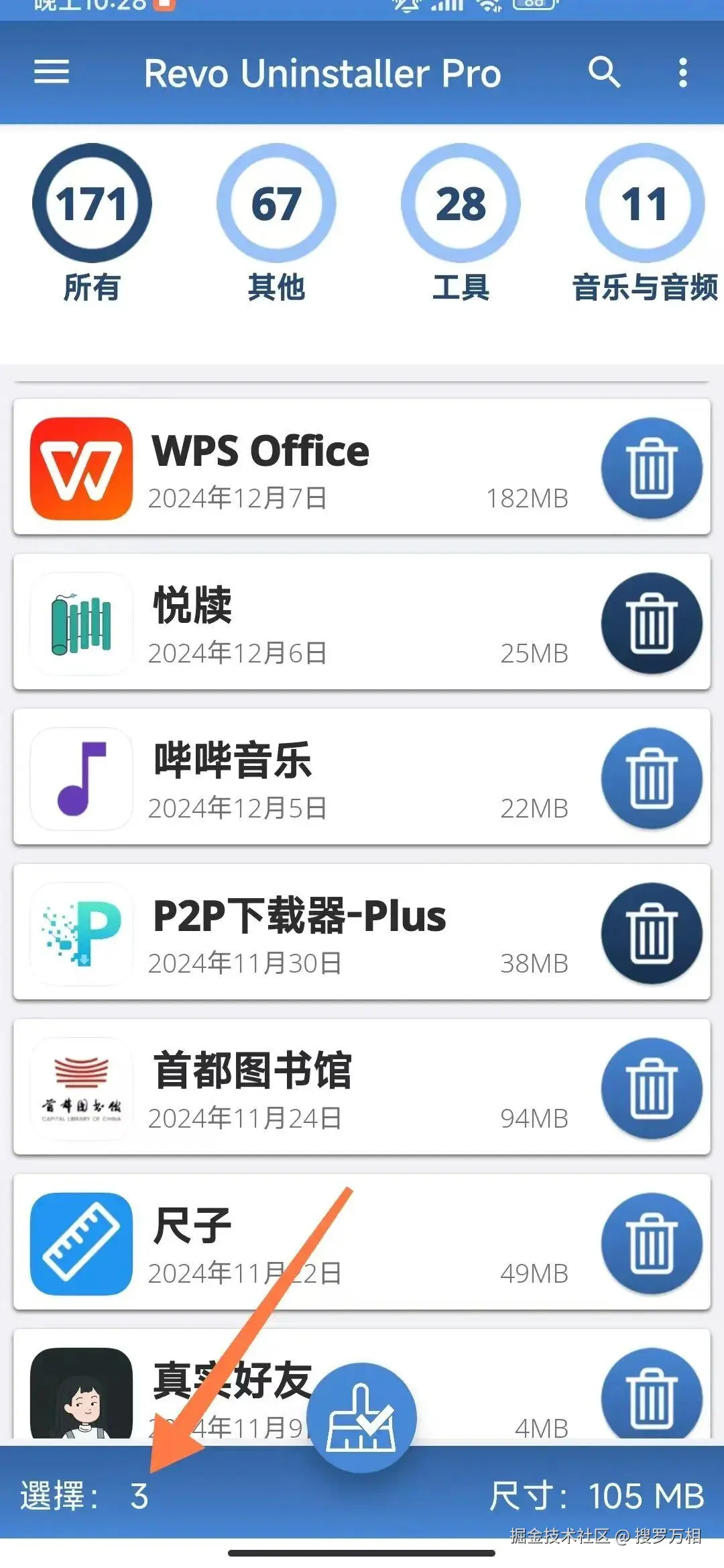 点击软件后面的删除按钮即可选择要删除的APP,选择的个数在左下角有显示,卸载完成后,软件会自动查找残留,然后全选后点【删除余下文件】即可。