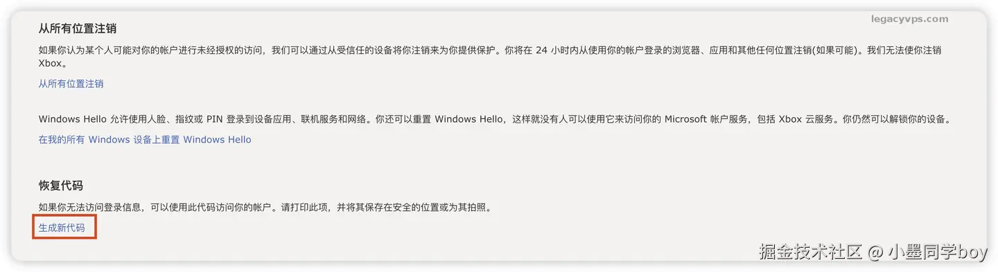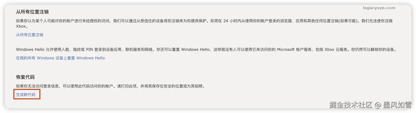 - 在“高级安全选项”页面,向下拉,找到 “恢复代码” (Recovery code) 区域。