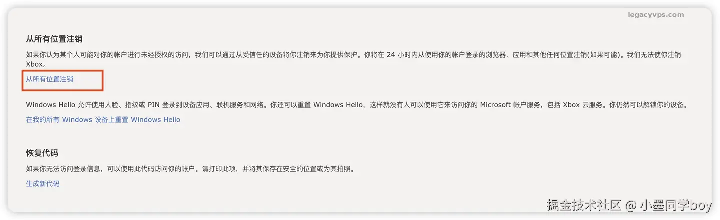 - 在“高级安全选项”页面下方,找到 “注销我” (Sign me out) 或 “注销所有位置”。