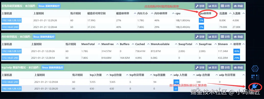 实时表格插件:横向对比分布式集群中各节点指标,支持排序