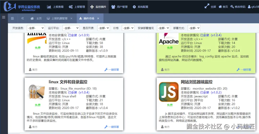 - 插件支持 一键部署、移除、启用、禁用