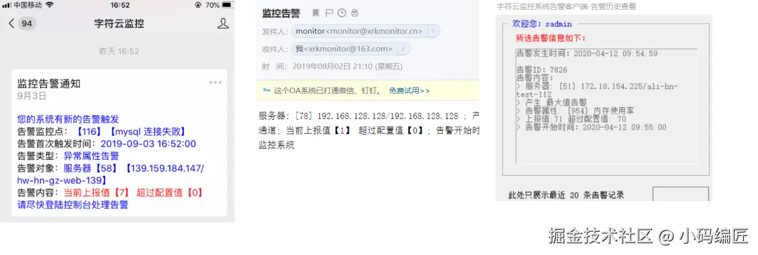多通道告警:邮件、短信、微信、PC 客户端等,开箱即用