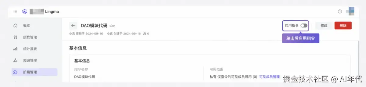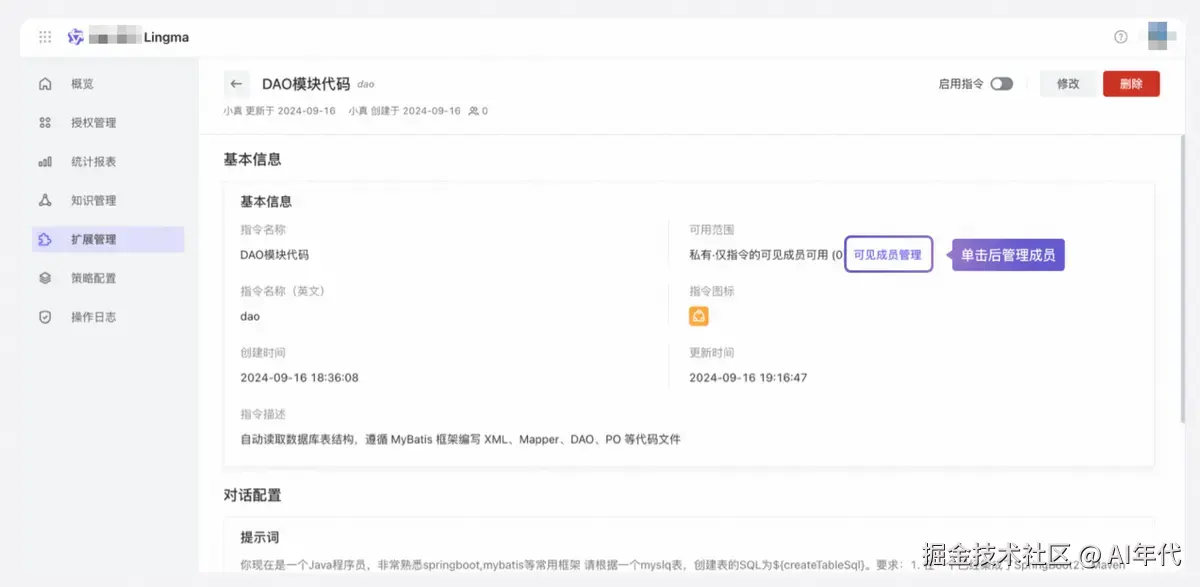 单击指令卡片,即可进入指令详情页面,查看指令的基本信息、可见成员范围、对话配置等信息。同时还可以查看指令的使用数据。