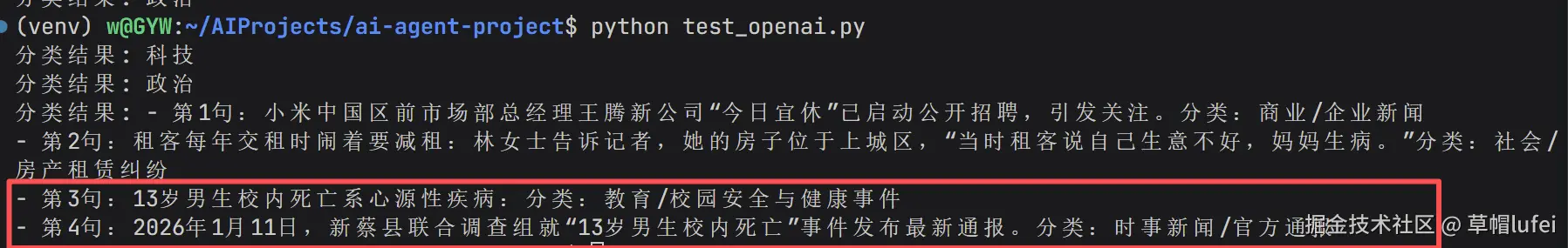 下面提供了两个文本,一个是科技类的,一个政治新闻,让AI进行基础的文本分类