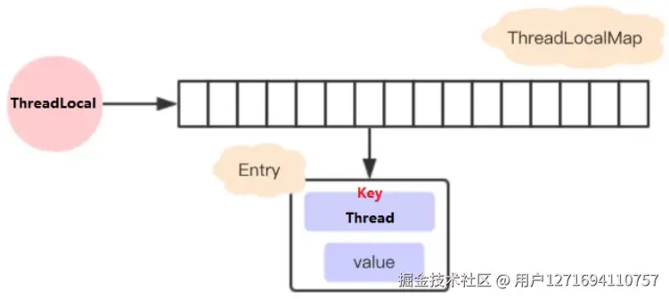 threadRef -> currentThread -> threadLocalMap -> entry -> key(弱引用) -> ThreadLocal实例(可被GC回收)