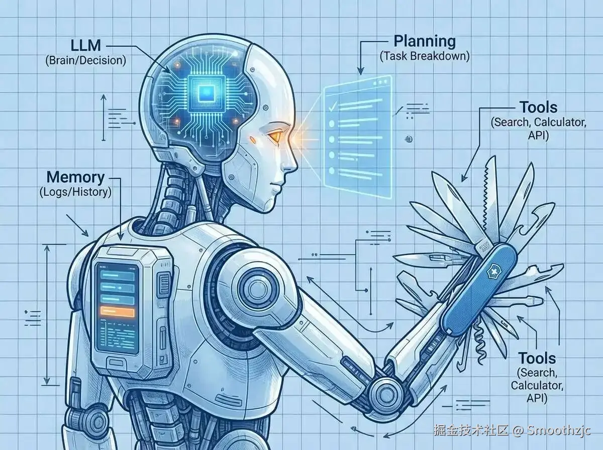 - 通俗解释: 以前的 AI 只是个 “大脑” (LLM),能陪你聊天、回答问题,但没手没脚。而 Agent 就是 “大脑 + 双手 + 工具箱” 。它不仅能动脑子,还能根据你的目标,自己去上网、查文件、写代码,把活儿干完。