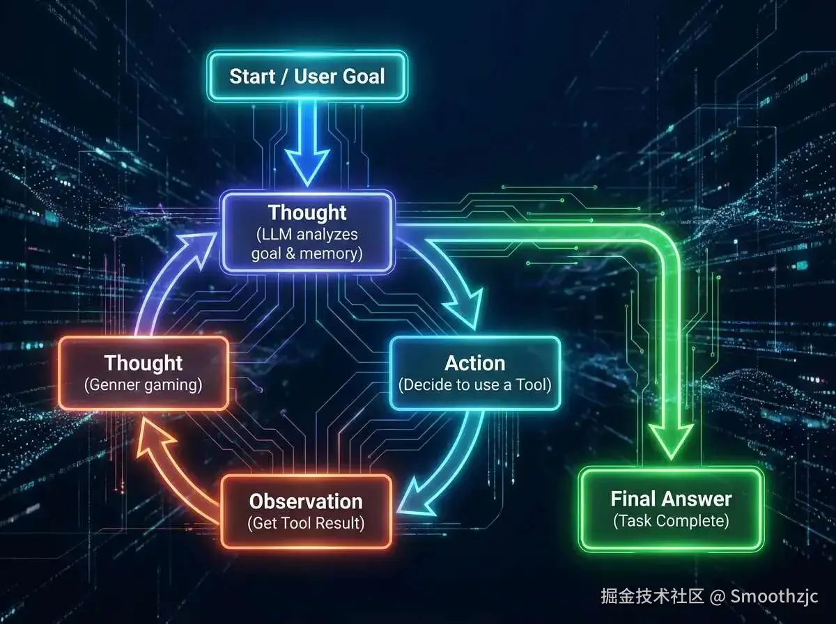 目前最流行的让 Agent 动起来的方法,叫 ReAct 模式(Reasoning + Acting,即:推理 + 行动)。