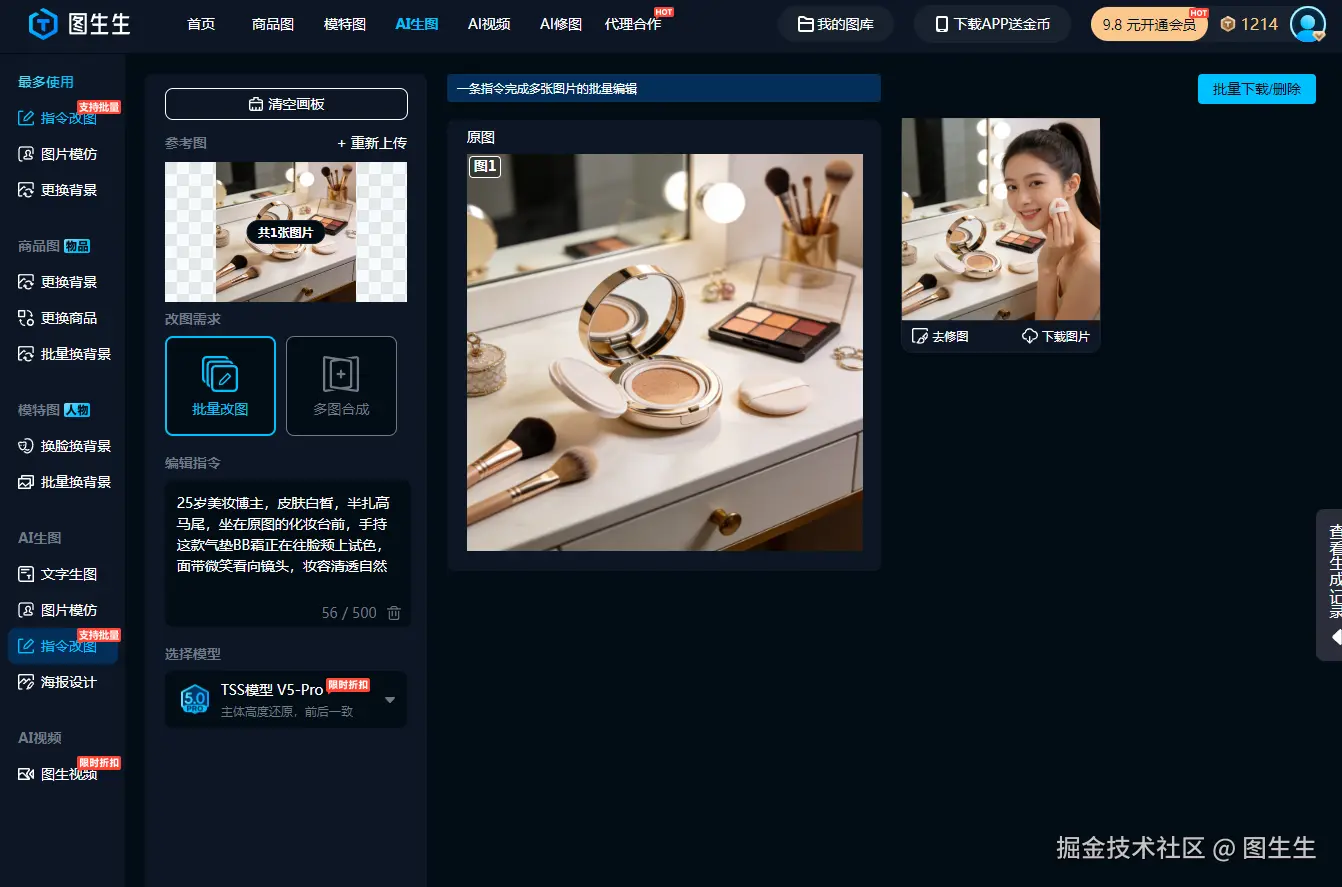 AI指令改图功能,正好解决这一痛点!上传商品场景图,一句话指令就能快速生成符合预期的模特图,精准适配电商运营需求。