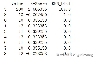 输出结果如下,输出中 -1 表示异常值,可以看到其他一些值(如 11 和 13)也被标记为 -1,这是因为 n_neighbors=2 对小数据集太小,导致局部密度计算不稳定。