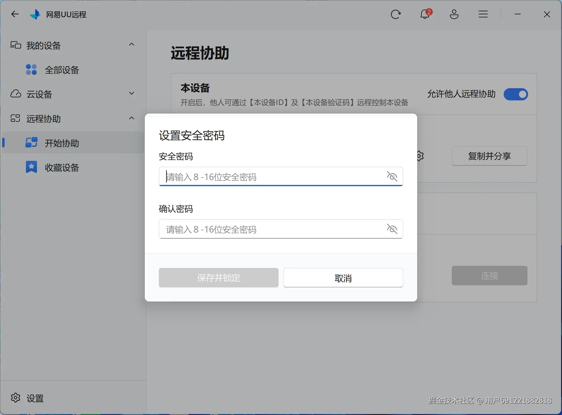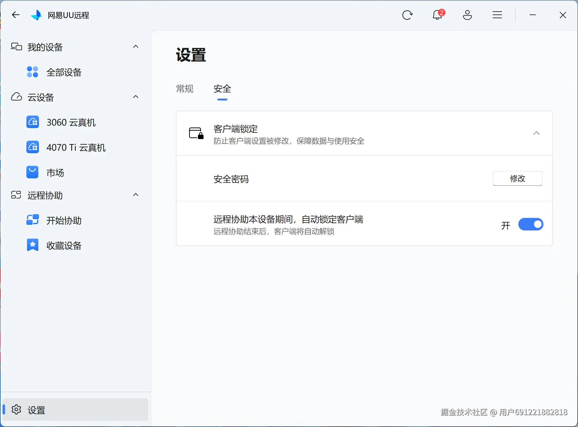 - 手动锁定,稳如磐石:在远程协助前,可以在UU设置里给客户端设置一个8-16位的安全密码(比如“Safe2024”)。开启协助后,点一下“锁定客户端”,对方的UU界面就会变成“只看版”,键盘、鼠标全都被禁用,彻底杜绝误操作风险!想解锁?输入安全密码就行,方便又安心。