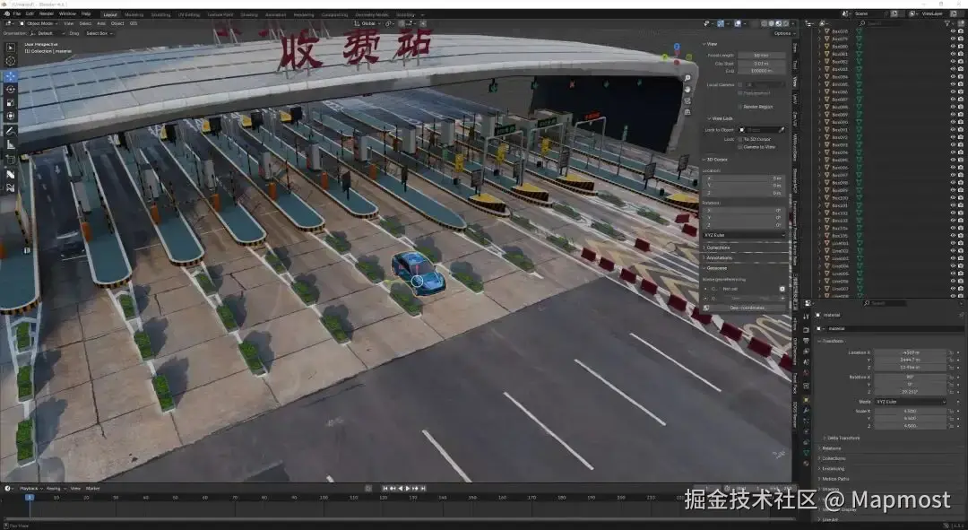 在Mapmost智慧收费站项目中,实景三维模型与手工精模需要衔接顺畅,但两者的纹理都来源于现场拍摄的照片,清晰度参差不齐。手工模型的材质细节不足,质感层级与实景模型对不上,放在同一场景中视觉差异明显。