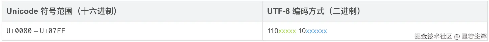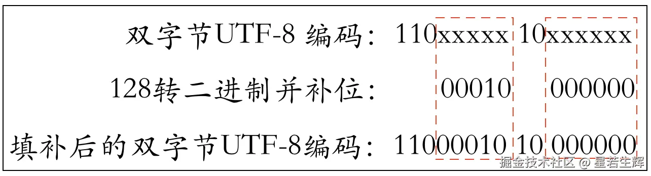 utf8 双字节编码的有效位共 5 + 6 = 11 位(第一个字节的 xxxxx 是 5 位,第二个字节的 xxxxxx 是 6 位),需将 128 的二进制值填入这些位置。先将128的二进制 10000000 补足为 11 位(左侧高位补0因为左侧补0不影响原二进制的值):00010000000