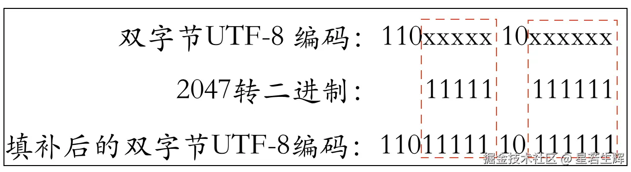 当utf8用双字节存储Unicode码点时它的区间范围就是128(用十六进制表示就是0x80)到2047(用十六进制表示就是0x7FF)。接下来让我们具体解析下utf8双字节填充规则