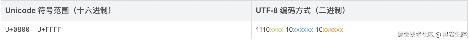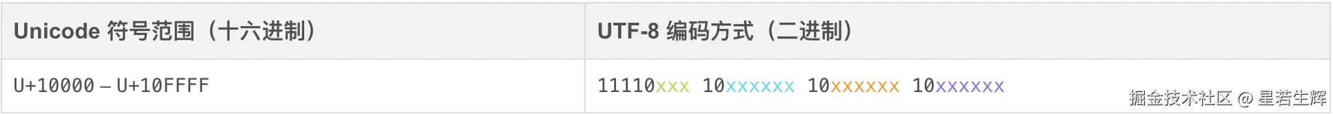 n 字节(n>1):首字节前 n 位为 1、第 n+1 位为 0,后续字节前两位固定为 10,剩余位承载 Unicode 码的有效信息。