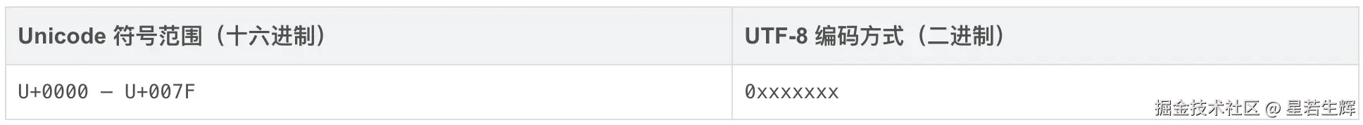 如上定义所示utf8单字节存储范围是 0x0 到 0x7F 用十进制表示就是0到127并且最高位恒定为0,这与ASCII码使用的范围完全相同。因此utf8单字节存储Unicode的二进制写法就是 00000000 ~ 01111111 文章的末尾我会给出ASCII码十进制与字符对照表这里不再赘述