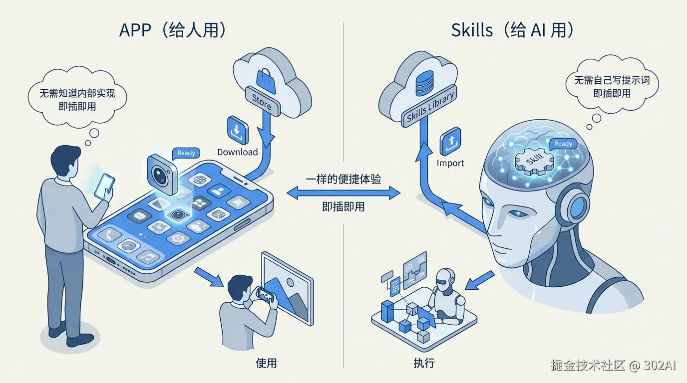只不过 APP 是给人用的,Skills 是给 AI 用的。