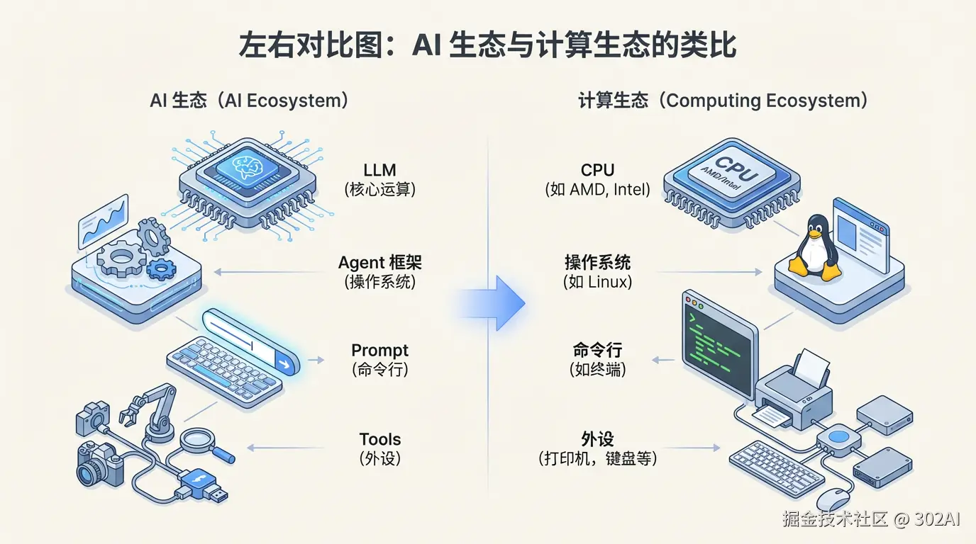 我们之前使用 Agent 的方式,就像每个人都在一个原始操作系统上,一行一行地敲命令:效率低,门槛高,难复用。
