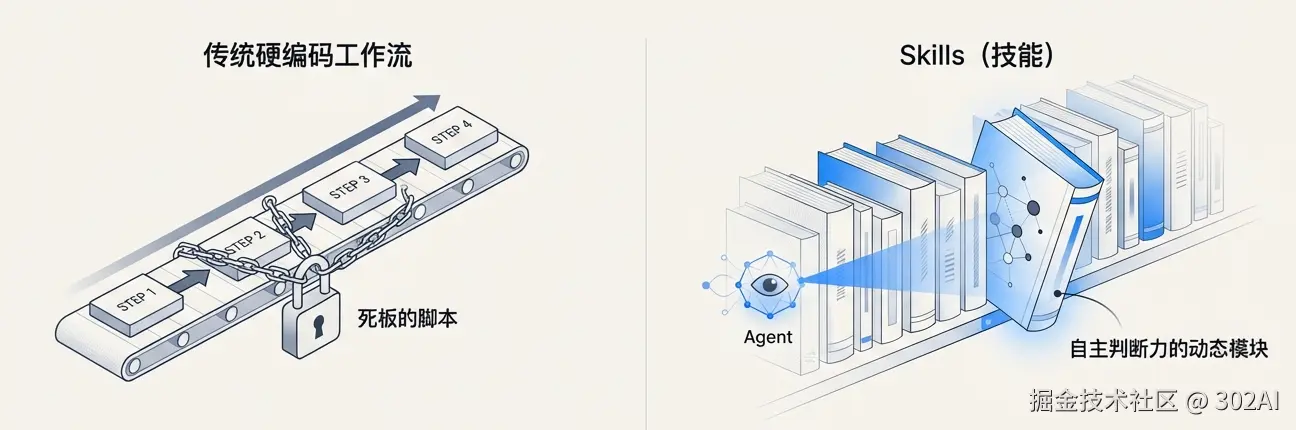 一句话概括: 工作流****是死的,Skills 是活的 。