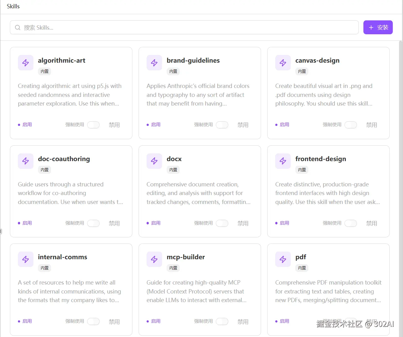在这个界面中,你可以对 Skills 进行管理和使用。