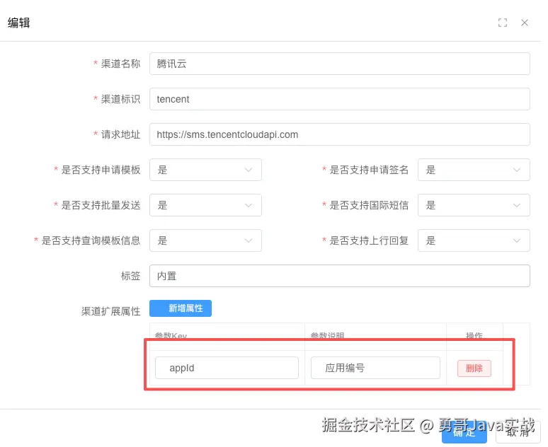 如图,腾讯 SDK 发送短信需要配置 appId , 我在设计页面时,增加了渠道扩展字段,可以动态的添加属性。