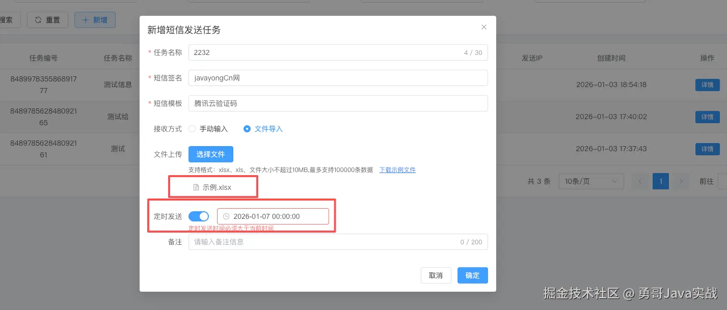 - 管理端支持大规模批量发送 支持通过界面上传 Excel 文件进行批量发送,能够稳定处理十万级别的发送任务。