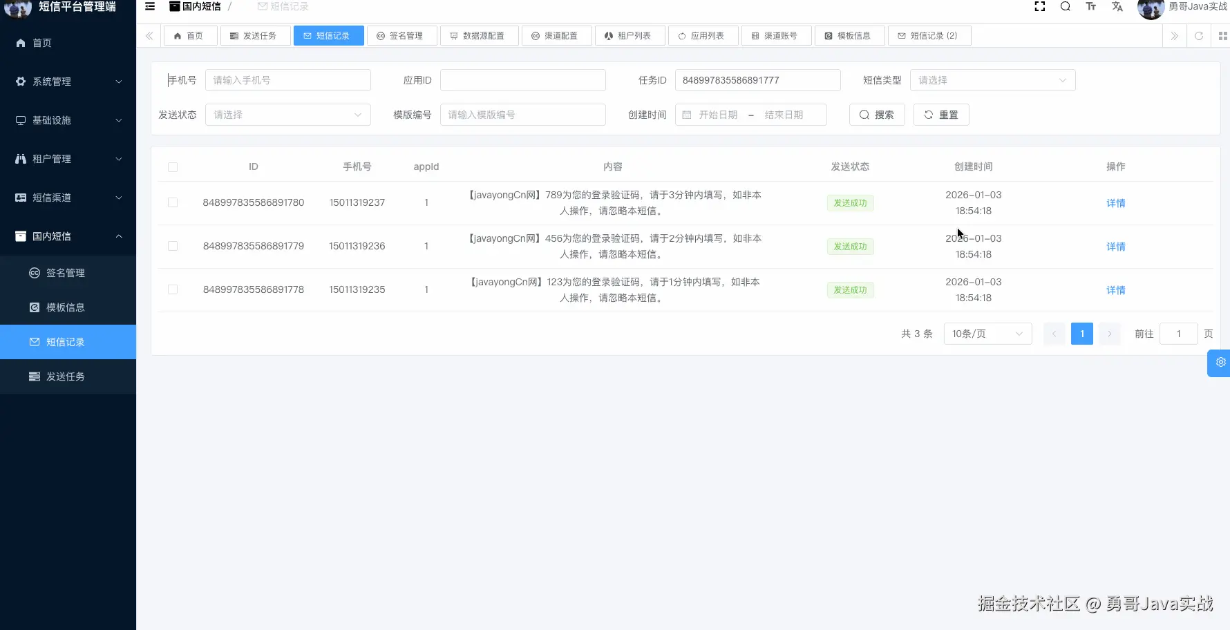 提交任务之后,可以查看任务列表 以及任务详情 ,也可以精确到通过哪个渠道发送短信。