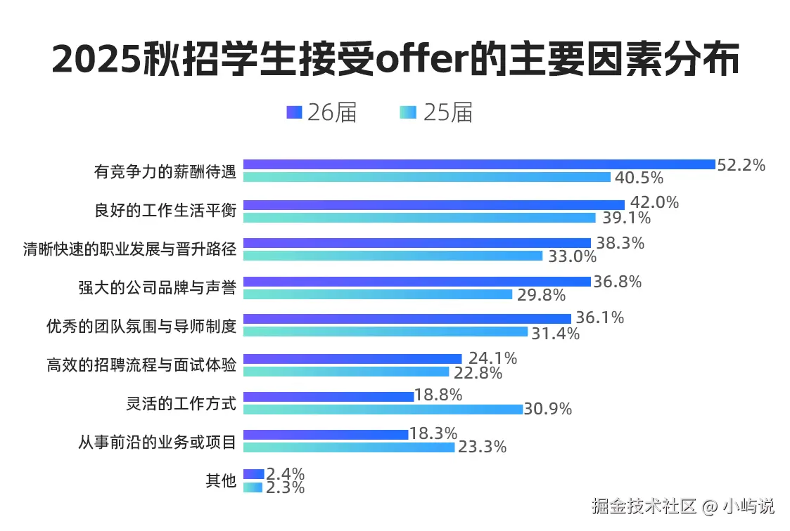 “理想很丰满,现实要吃饭”——这届毕业生的求职态度格外务实。调研显示,52.2%的毕业生接受offer的第一理由,是“有竞争力的薪酬待遇”。发展前景、工作生活平衡当然重要,但一份能体现价值的薪水,才是最实在的底气。那么问题来了:什么岗位,最“值钱”?