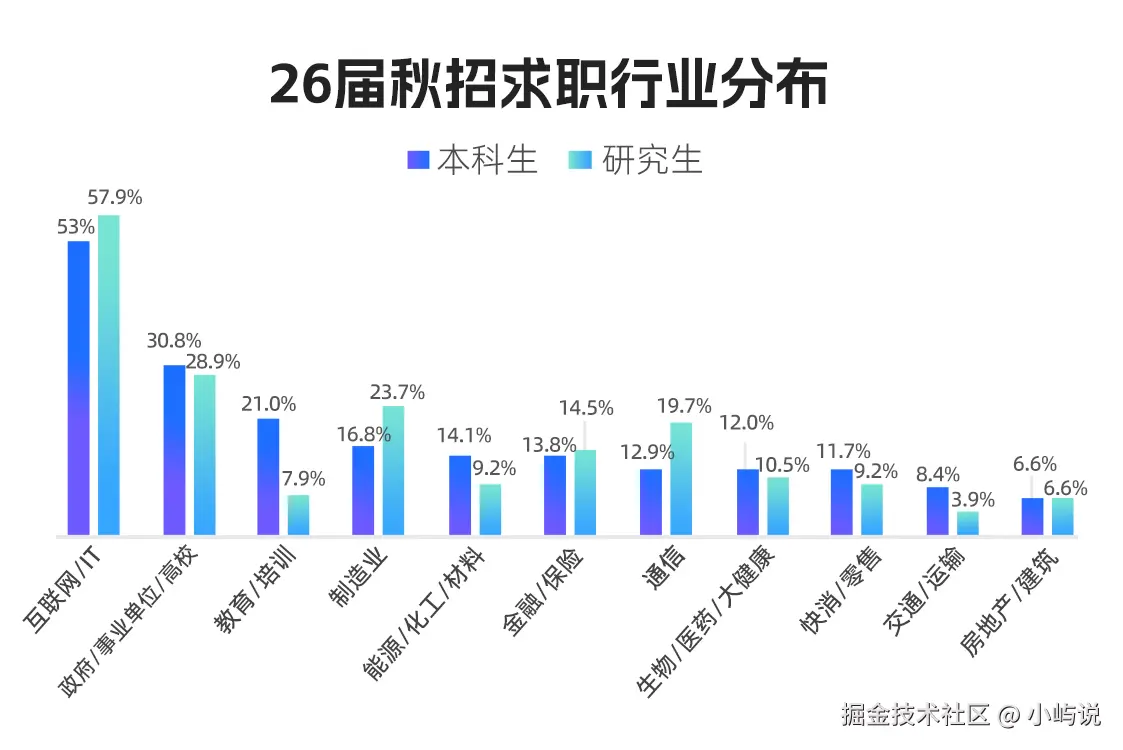 数据显示,在最想去的行业里,互联网/IT以本科53%、研究生57.9%的压倒性比例,稳居毕业生首选。简单说,每两个毕业生里,就有一个想进互联网圈。用技术能力说话,依然是大家公认的“硬通货”。