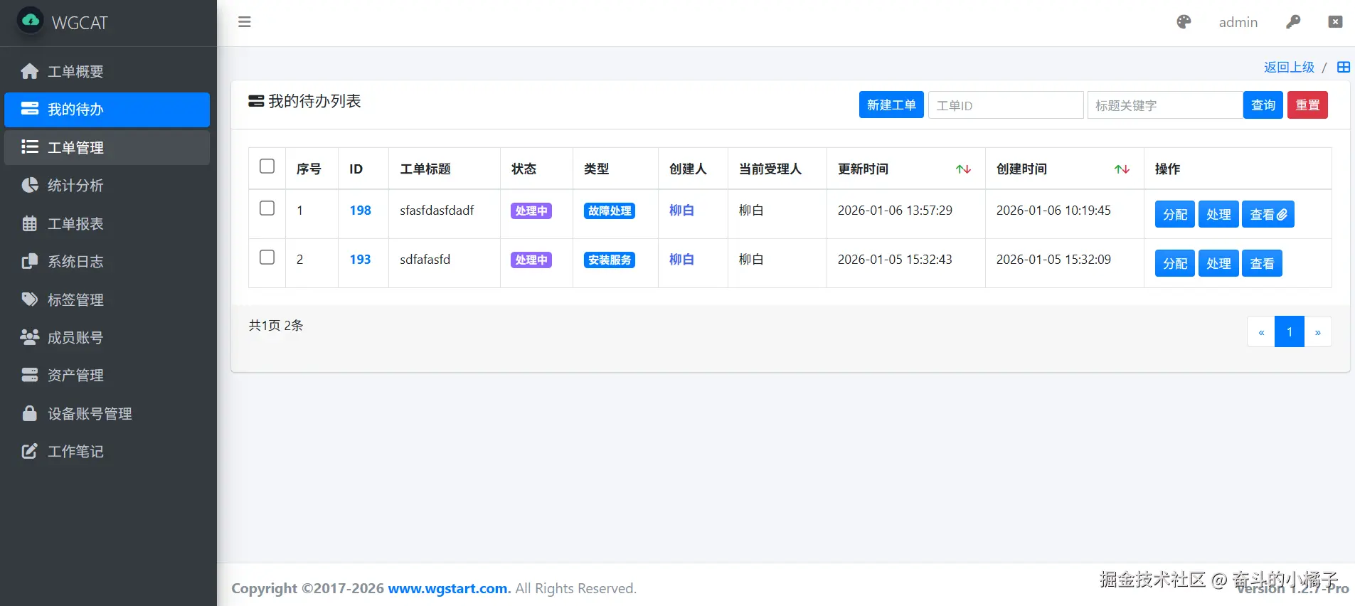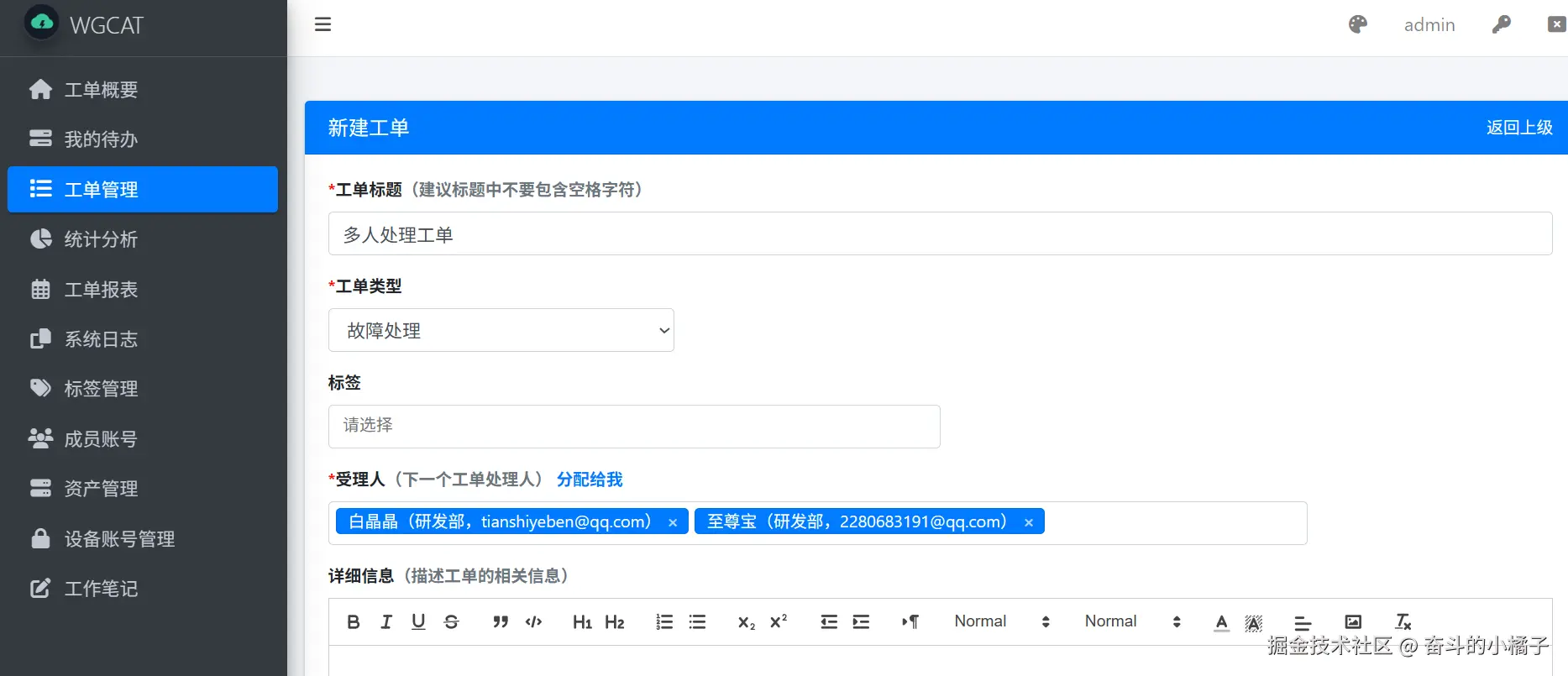 WGCAT工单系统操作指南,如何将工单指派给多人处理 奋斗的小橘子 2026-01-12 27 阅读1分钟 WGCAT工单系统(www.wgstart.com)在v1.2.7版本已经支持将工单指派给多人进行处理 我们新建工单时候,就可以选择多个处理人,系统会生成多个工单,每个受理人一个工单 如下图